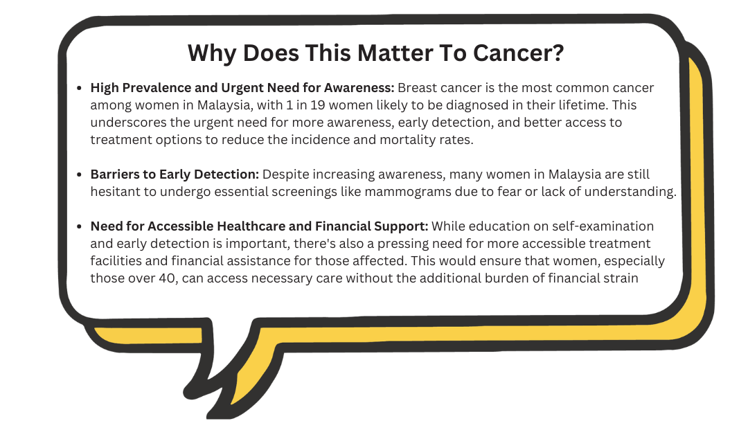 Despite progress in awareness, challenges remain in reducing breast cancer mortality. One of the major barriers is late-stage diagnosis. Many women in Malaysia are still reluctant to undergo mammograms or clinical breast exams, often due to fear or lack of understanding about the importance of early detection. Studies have shown that when breast cancer is detected in its early stages, the survival rate increases significantly.