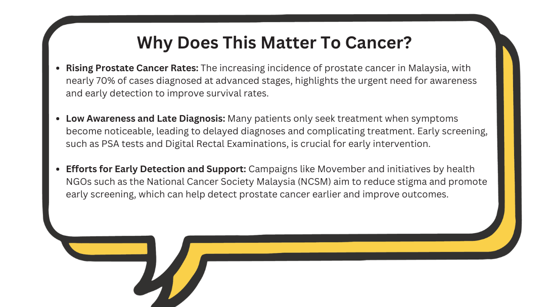 In many countries including Malaysia, campaign such as Movember helps to reduce the stigma surrounding the disease. The campaign encourages men to get early screening for their health including prostate cancer screening.