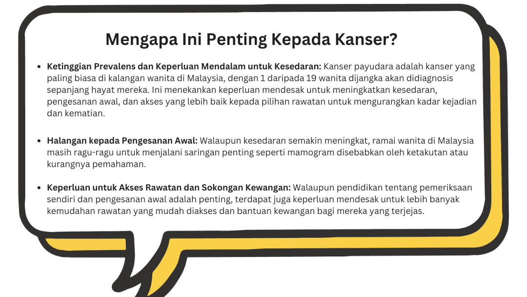 Kanser payudara terus menjadi kanser yang paling biasa didiagnosis di kalangan wanita di Malaysia, mewakili 32.1% daripada semua kes kanser di kalangan wanita. Menurut Persatuan Kanser Nasional Malaysia (NCSM), kira-kira 1 daripada 19 wanita di Malaysia akan didiagnosis dengan kanser payudara sepanjang hayat mereka. Statistik yang membimbangkan ini menekankan keperluan mendesak untuk meningkatkan kesedaran, pengesanan awal, dan pilihan rawatan yang boleh diakses.