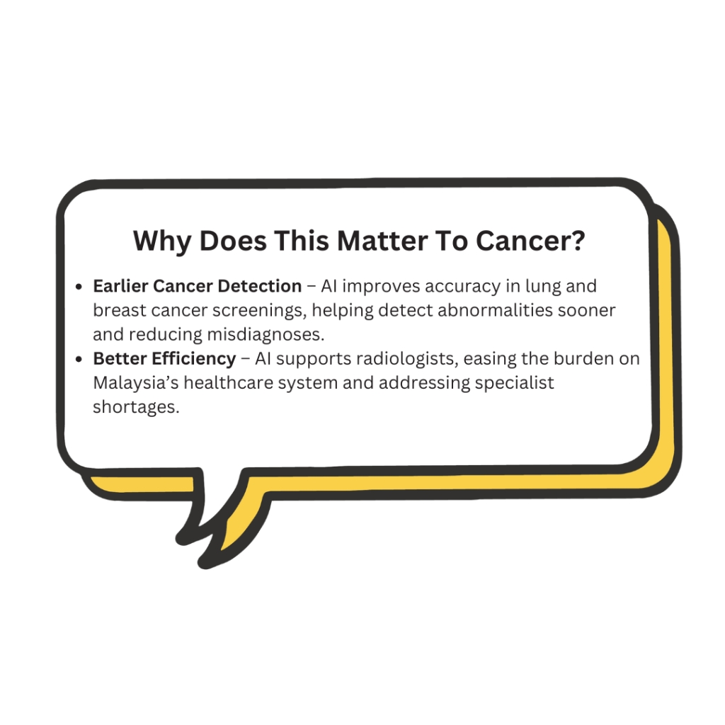 AI serves as an additional layer of review, functioning as a ‘second pair of eyes’ to identify lung nodules at an earlier stage with greater precision. This technology is currently being tested at the National Cancer Institute (IKN), with plans to extend its use to Cyberjaya Hospital, Tengku Permaisuri Norashikin Hospital in Kajang, and Putrajaya Hospital.